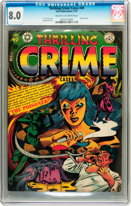 Finest Known, Overstreet: $100 in 9.2 For this report's "the cover sells the book" example, I'm happy to say there are people out there who still recognize the brilliance of the top L. B. Cole covers. At his best, Cole created some of the best comic book covers ever. The Thrilling Crime below is a great example. Graded CGC VF 8.0, it brought in a tidy $1,314.50, well above our old value in the $400s, and miles above the current Overstreet value of $284.00. I'm going to close comics this round with some disturbing inconsistencies in the market - see below.