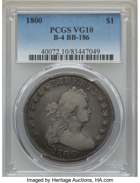 Coins We doubt anyone can show us another site that A) computes a VG-10 value for all certification options, for an 1800 Draped Bust Silver Dollar, B-4, BB-186, and B) has pricing as tight as ours. The example shown below sold recently via Heritage for $1,116.25, and our current PCGS value in that grade is $1,180.00.